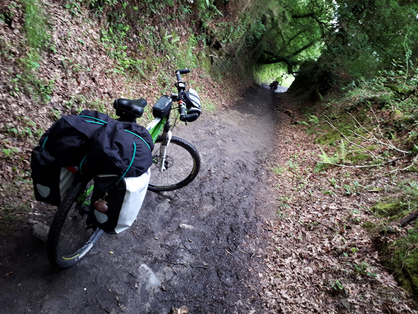 Llevamos 3 km de los cuales hemos hecho uno entero andando, subiendo por un camino lleno de barro, hojas, agua que baja por el y mucha mierda de vaca. Seguimos subiendo con mucho barro durante 4 kms más.
