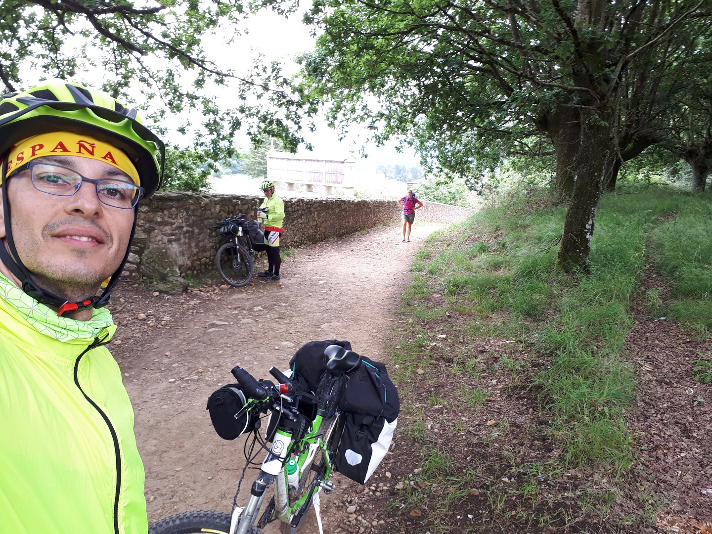 Llegamos a Gonza y decidimos sellar en un bar, cuál es nuestra sorpresa que al entrar nos encontramos a Miguel, Manolo y Adrián que están almorzando. Hablamos con ellos un rato y continuamos nuestra marcha unos kilómetros más adelante nos dan alcance y pedaleamos junto a ellos un rato. También nos topamos con unos cuantos ciclistas veteranos que van haciendo el camino desde León, llevan una furgoneta de apoyo con todo el equipaje.