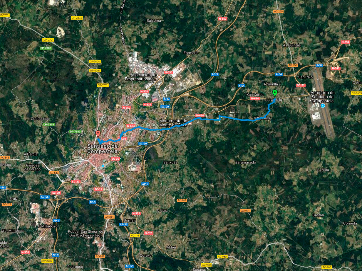 Continuamos con la micro etapa, la Plaza del Obradoiro nos espera, en un momento pasamos junto al aeropuerto, mañana lo veremos de cerca, sin apenas darnos cuenta llegamos a las afueras de Santiago de Compostela.