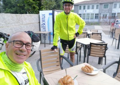 A los tres o cuatro kilómetros encontramos un bar donde desayunamos y nos clavan 9 € y medio por dos croissants con mermelada un batido de chocolate y un zumo de naranja natural.