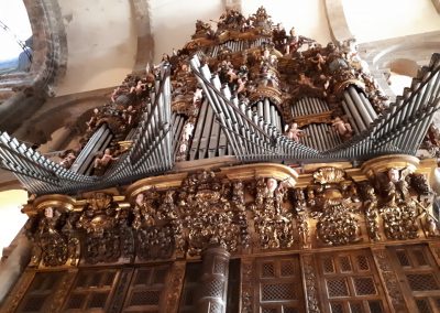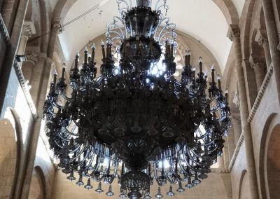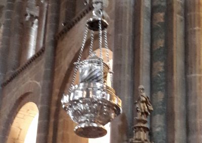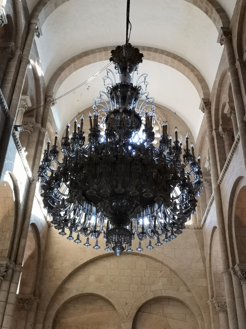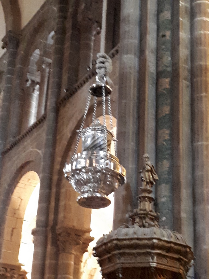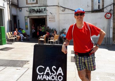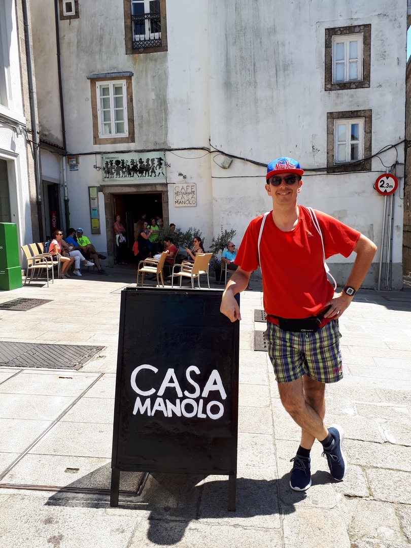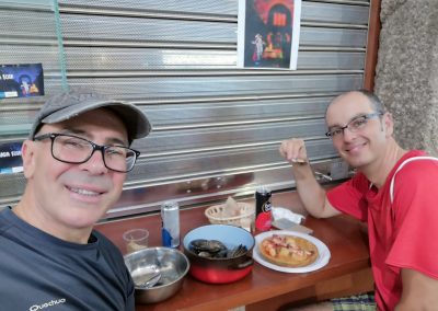 Después de una ducha y ponernos cómodos, volvemos al centro a comer, esta vez andando y en los bares que hay en la plaza de abastos, nos damos el homenaje con un plato de pulpo y unos mejillones al vapor con cervecita. Después entramos en un restaurante y menú del día para dos. Chipirones a la plancha de primero para los dos y de segundo, rodaballo para Manolo y filete de atún para un servidor. Siesta en el hostal y a las 7:30 misa del peregrino, en la cual canta una monja que nos deja con la boca abierta. Terminada la misa un paseo y a cenar, empanada de carne y un par de dulces. A dormir que mañana no hay que madrugar.