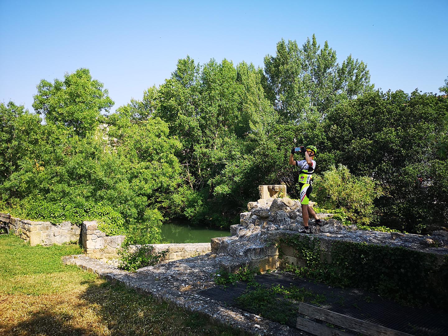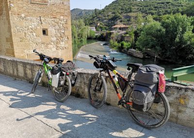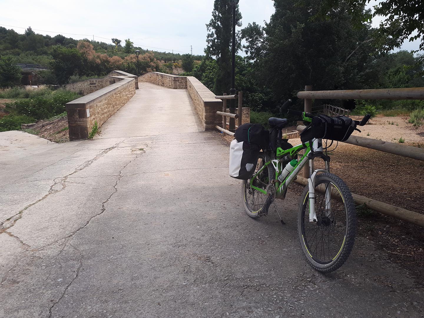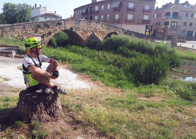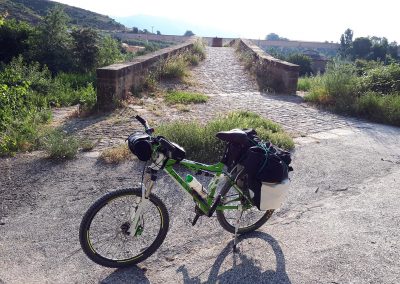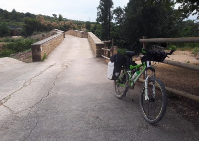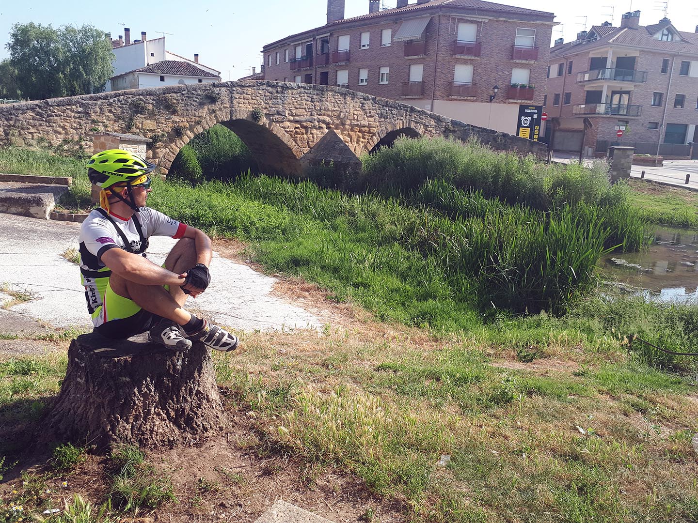 Salimos del albergue y antes de cruzar el puente de la reina, paramos en una pastelería para pillar algo dulce, 3 palmeritas para Manolo y dos magdalenas con chocolate para mi. Dejamos atrás el pueblo y el camino nos regala unas nubes de mosquitos que nos obligan a permanecer con la boca cerrada herméticamente, de vez en cuando los brazos se tiñen de negro con cientos de mosquitos atrapados en la crema de protección solar que nos echamos justo antes de salir. No hemos avanzado ni cuatro kilómetros y ahí tenemos el primer “pictolín picante”, pie a tierra y a empujar, menos de cuatro kilómetros recorridos y ya sudamos como pollos. Se suceden subidas y bajadas, más o menos duras. Los trayectos han discurrido en su mayoría por pistas de tierra y grava.