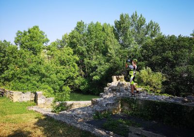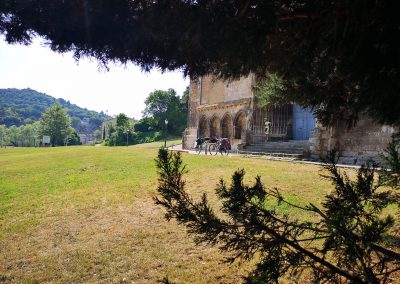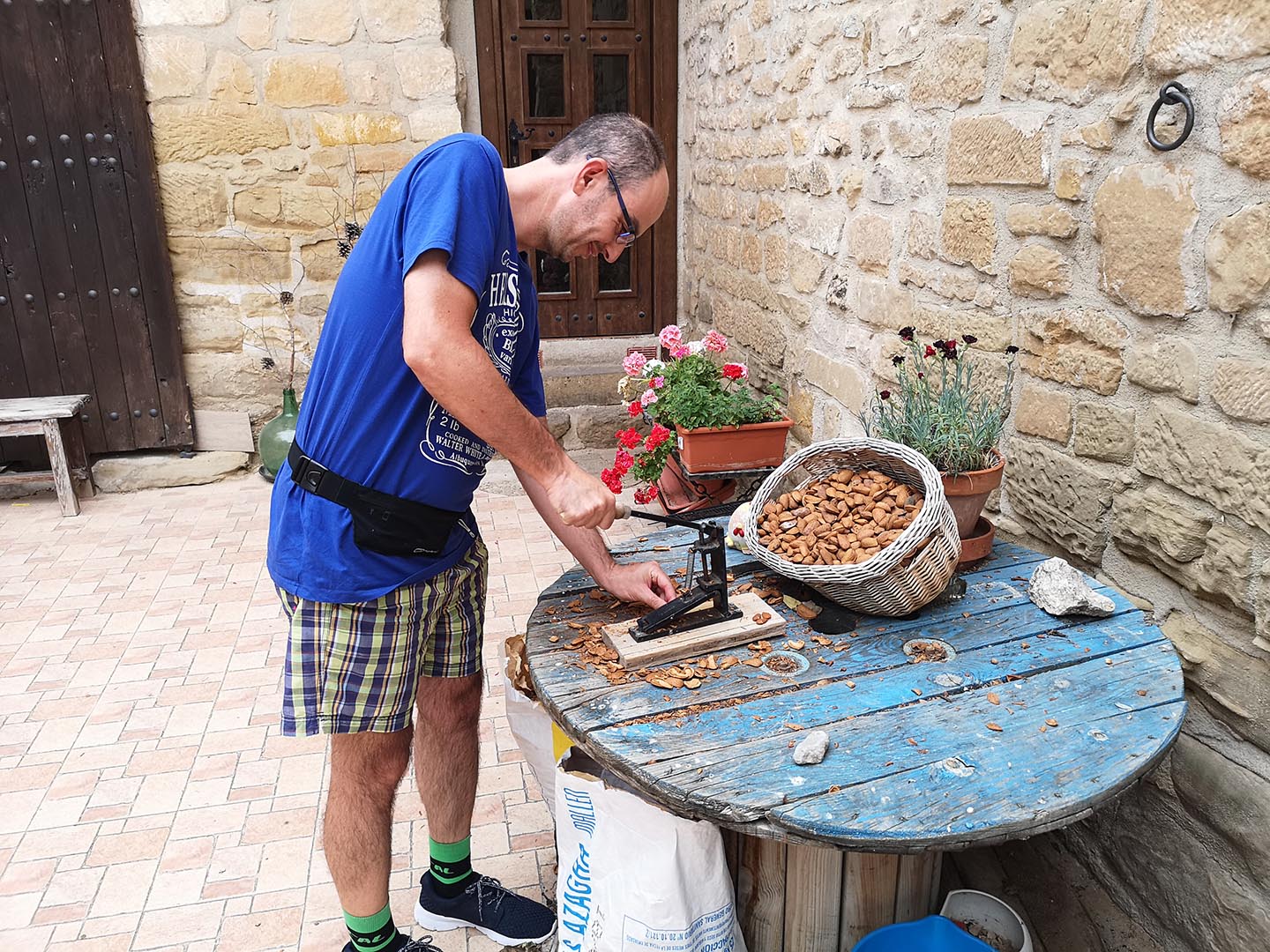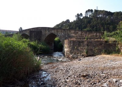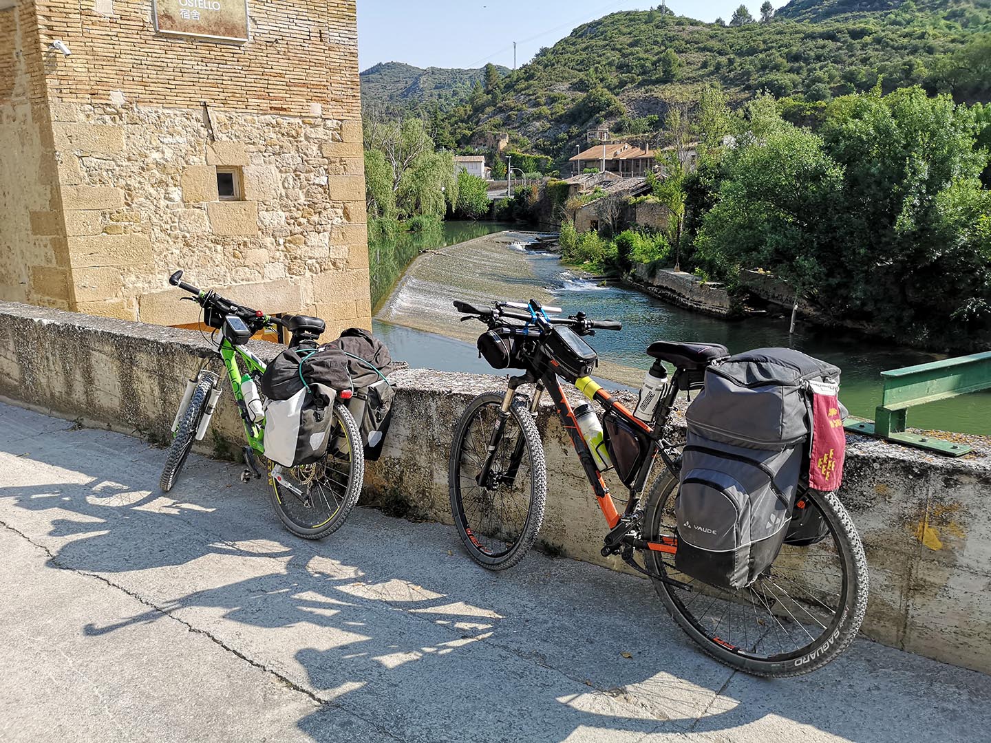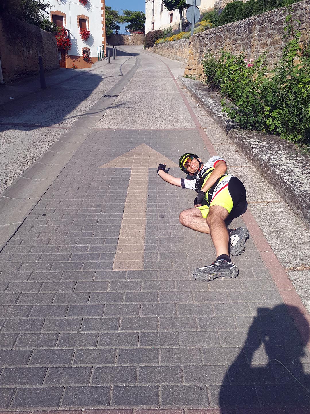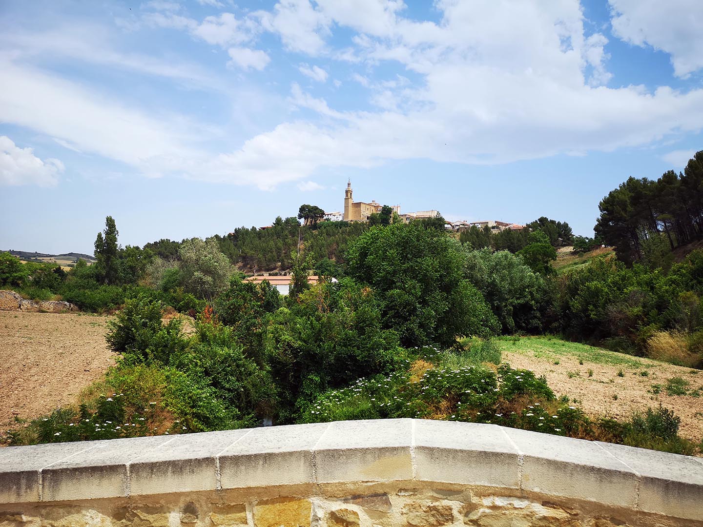 Salimos del albergue y antes de cruzar el puente de la reina, paramos en una pastelería para pillar algo dulce, 3 palmeritas para Manolo y dos magdalenas con chocolate para mi. Dejamos atrás el pueblo y el camino nos regala unas nubes de mosquitos que nos obligan a permanecer con la boca cerrada herméticamente, de vez en cuando los brazos se tiñen de negro con cientos de mosquitos atrapados en la crema de protección solar que nos echamos justo antes de salir. No hemos avanzado ni cuatro kilómetros y ahí tenemos el primer “pictolín picante”, pie a tierra y a empujar, menos de cuatro kilómetros recorridos y ya sudamos como pollos. Se suceden subidas y bajadas, más o menos duras. Los trayectos han discurrido en su mayoría por pistas de tierra y grava.
