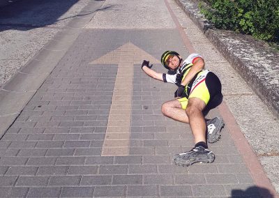 Buscamos donde nos puedan sellar la credencial y todos los albergues están cerrados, ya saliendo de la ciudad, llegamos a un albergue, el del polideportivo y allí una señora muy simpática nos estampa el sello y nos informa de donde podemos comprar algo de fruta y por donde sigue el camino. Después de comprar un par de plátanos y algo fresco para beber en el super de Richard, continuamos subiendo sin necesidad de echar pie a tierra.