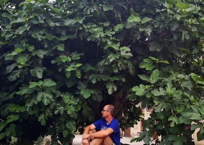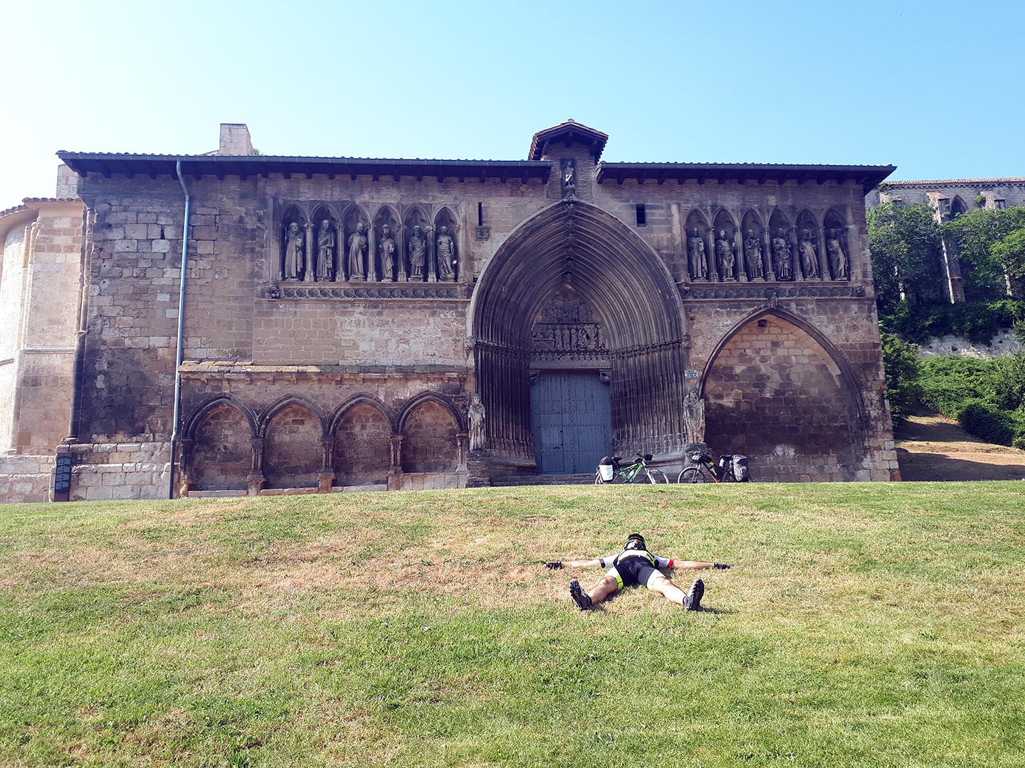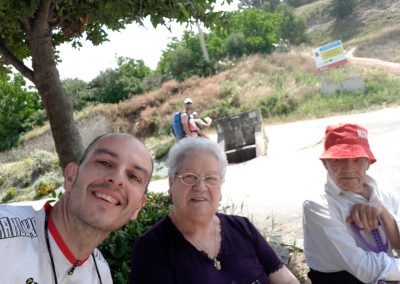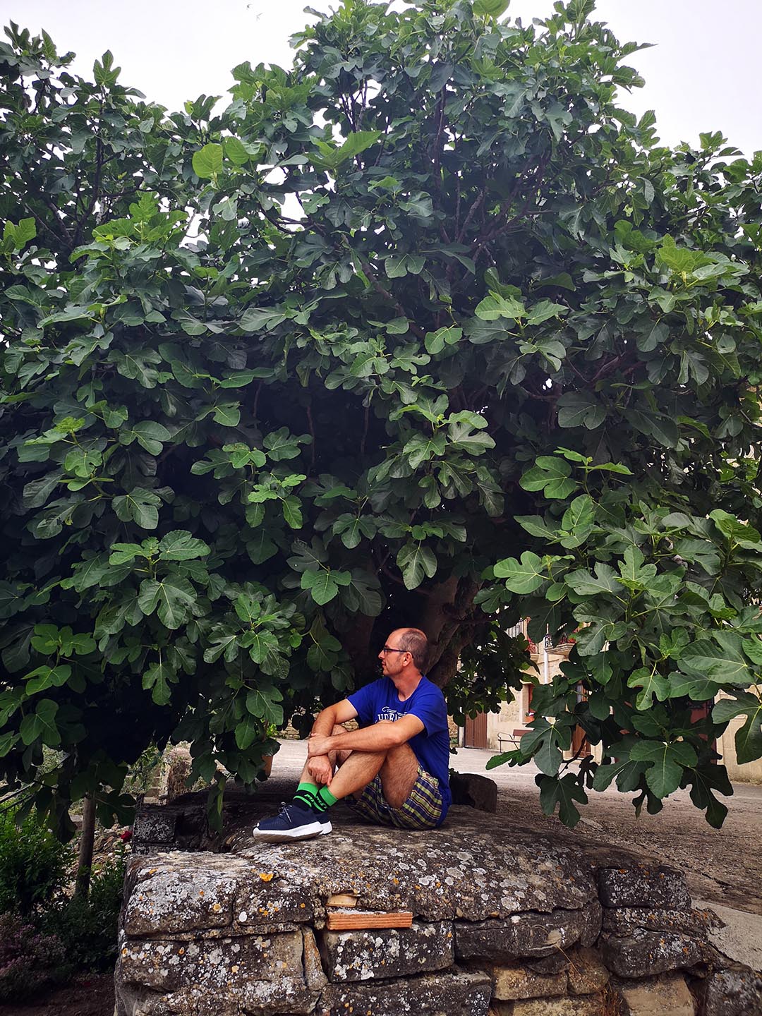 Llegamos a Los Arcos pensando que estábamos en Torres del Río, allí conocemos a María y Javier, dos simpáticos abuelos que después de hablar un rato con ellos, nos informan que para llegar a torres del río, nos quedan 8 km. Primera desmoralización. Pues nada, a seguir para adelante, estos últimos kms. el camino es más polvoriento si cabe, intentamos pasar lo más separado posible de los muchos peregrinos de a pie que vamos adelantando para no rebozarlos en polvo (en esta jornada hemos pasado a muchísimos). 2 o 3 kms antes de llegar a Torres del Río, no aguantamos más y paramos debajo del único árbol que se ve hasta donde alcanza la vista, allí descansa un peregrino de a pie, charlamos un rato con el, nos comemos los plátanos y seguimos.