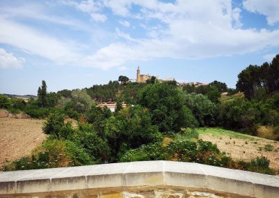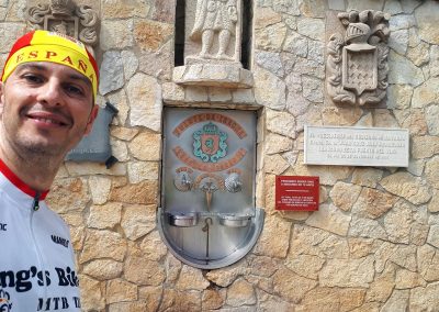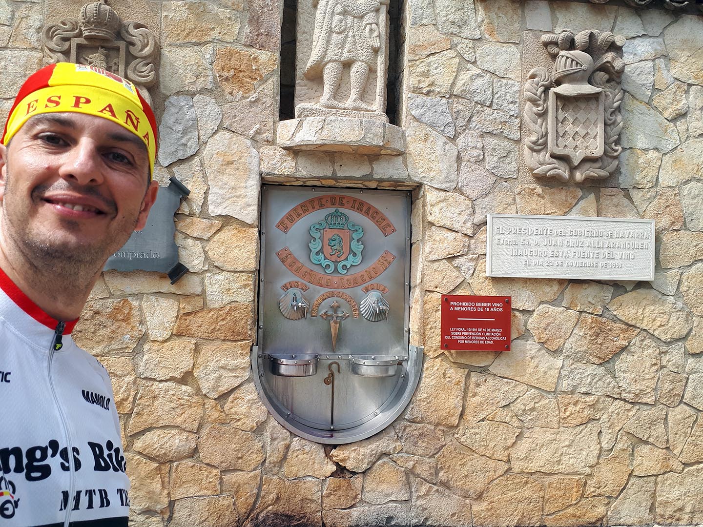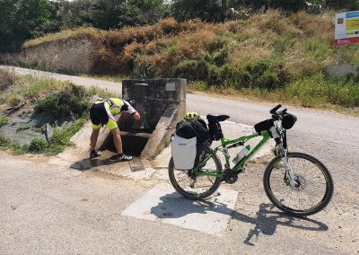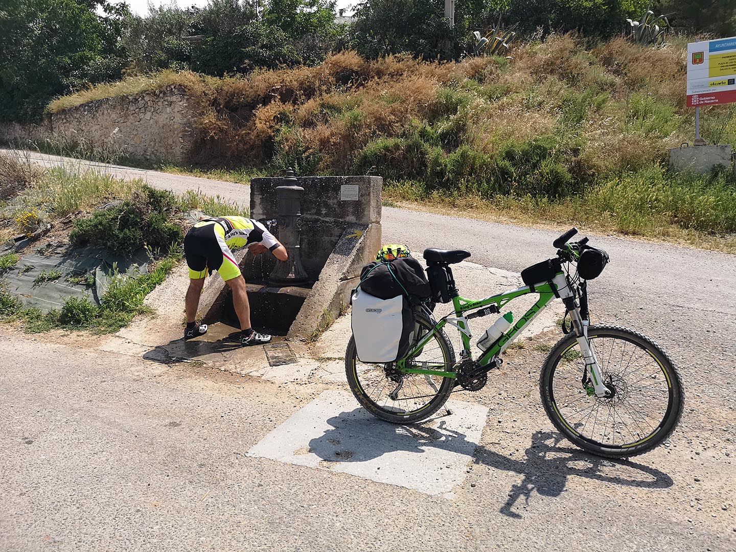 Tras pedalear un buen rato, siempre cuesta arriba, llegamos a otra fuente, pero esta es ¡¡de vino!! Naturalmente echamos un trago, Manolo con la Coca-Cola que se ha bebido hace un rato, se fabrica el calimocho en la tripa. Continuamos… subiendo como no podría ser de otra forma. Pasamos por grandes campos de cereales con un calor abrasador, y una cantidad de polvo bestial (las alforjas y las bicis se han cubierto de una generosa capa de polvo.