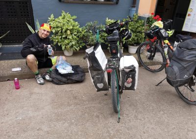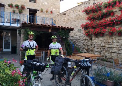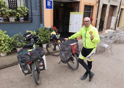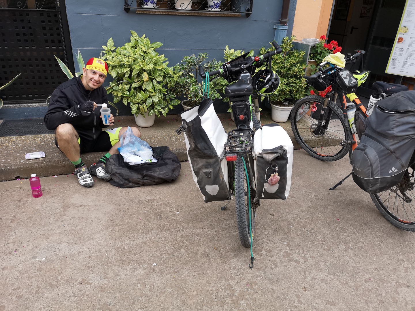 Jueves 28 de junio, 5:15 ya estoy con los ojos abiertos, he dormido del tirón. Hoy Manolo se ha despertado antes, quizás haya influido el ruido que yo he hecho, a las 6:30 ya estamos preparados para salir pero el buen hombre del bar no ha llegado y las bicis están bajo llave. Son las 6:50 y por fin llega el camarero, cogemos las bicis, preparamos los petates, engrasamos la cadena, foto antes de iniciar la etapa y en marcha.