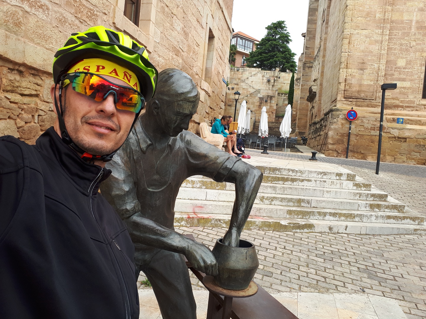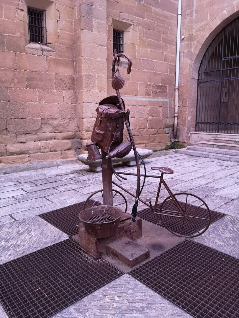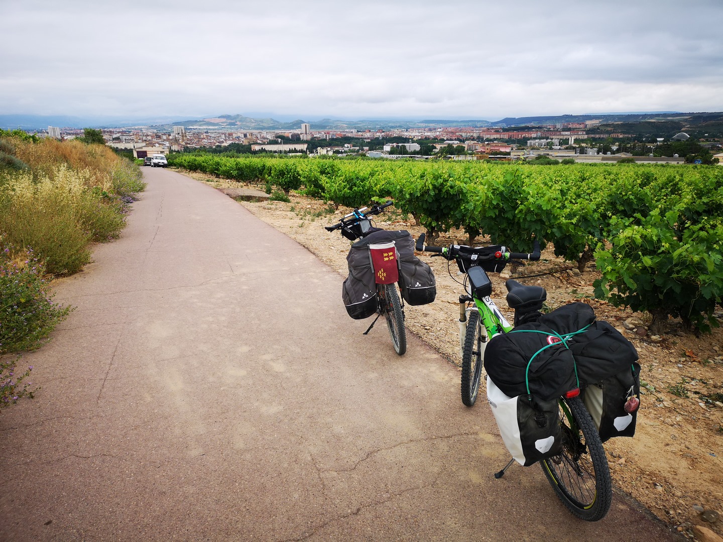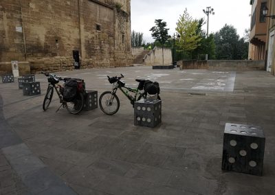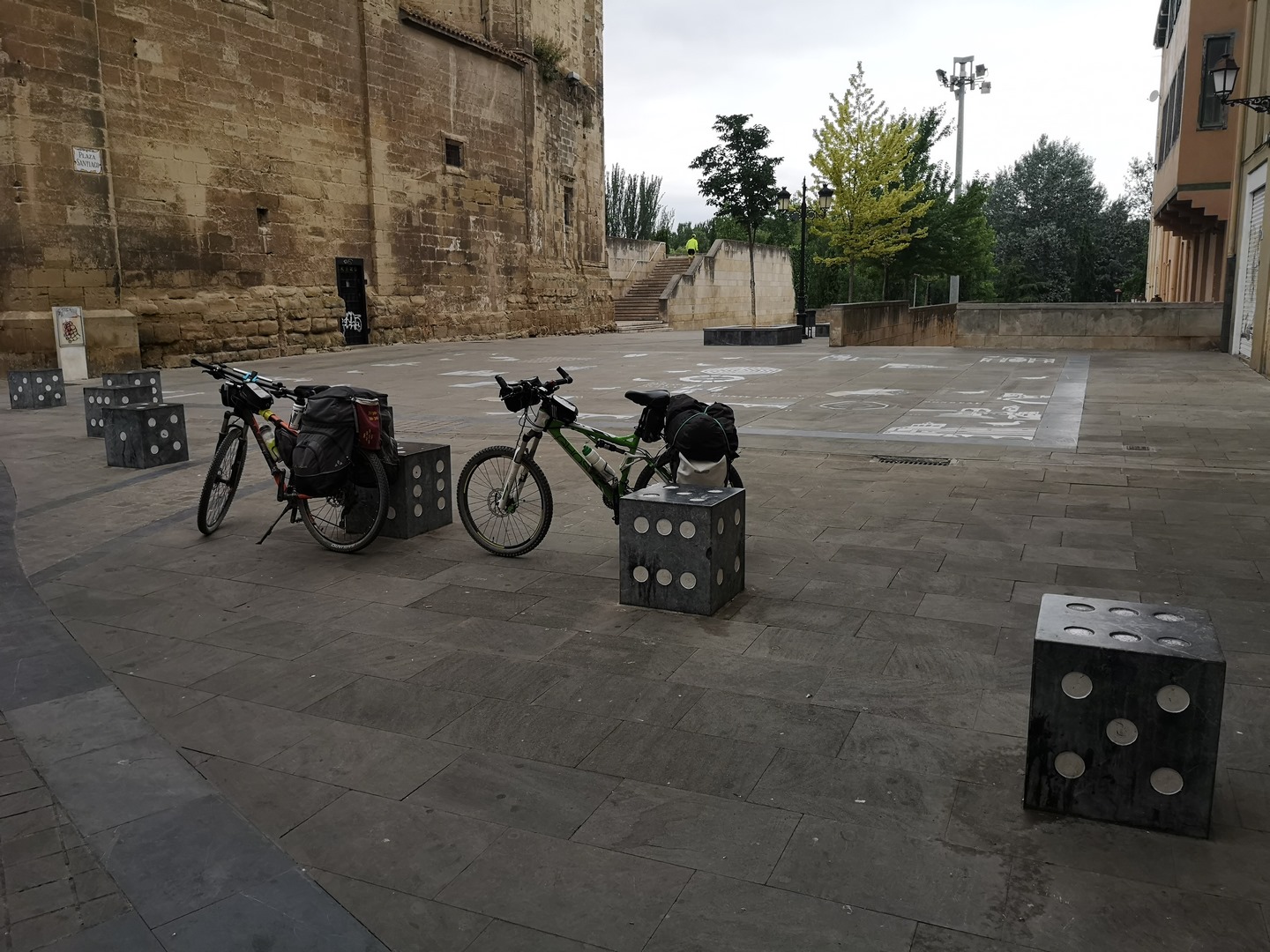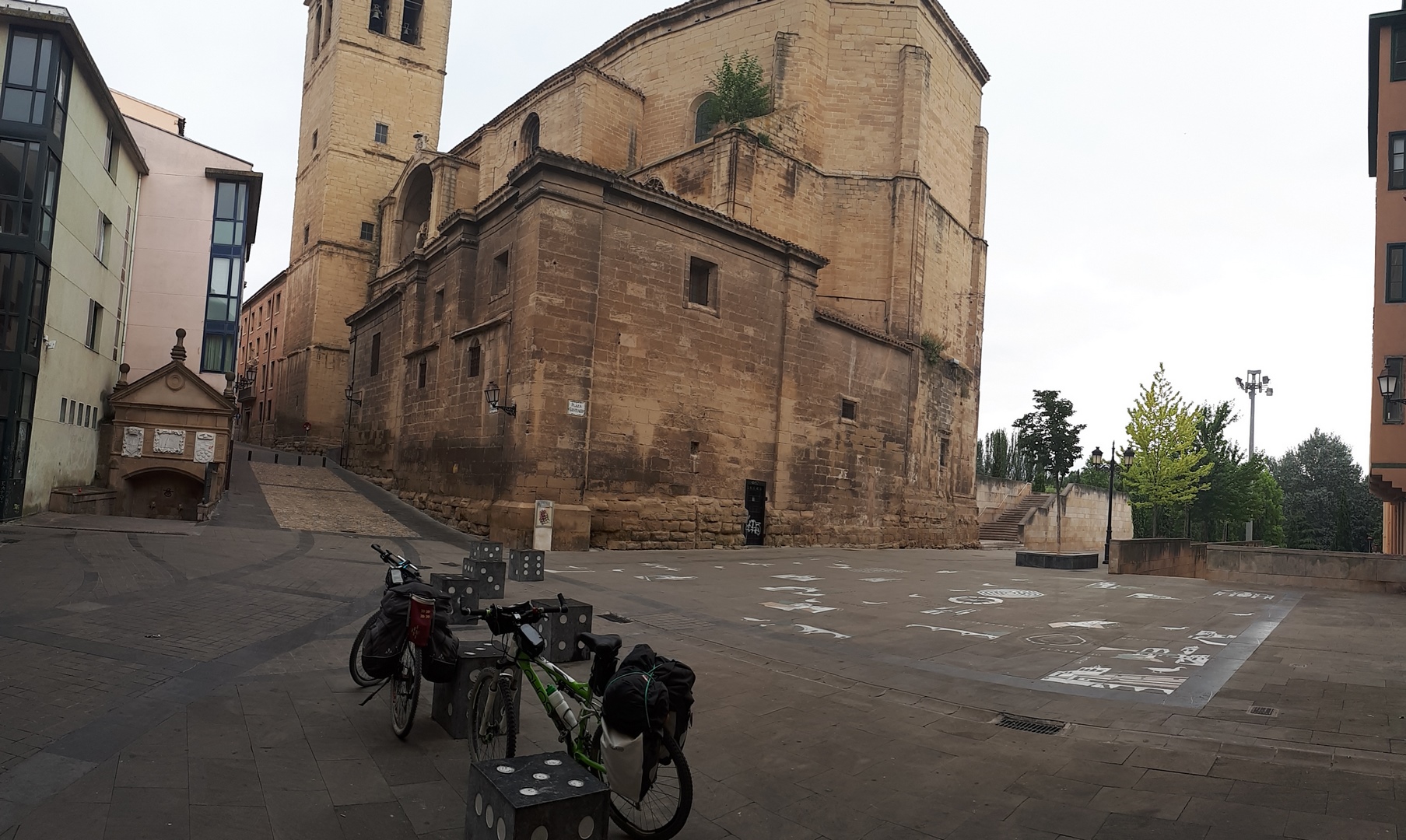 Por fin divisamos abajo, a lo lejos, Logroño, pedaleamos entre viñedos y nos hemos puesto ya el cortavientos porque hace fresquito y bajando se hiela el cuerpo. Llegamos al centro de Logroño donde nos sellan la credencial en el Centro de Información al Peregrino, justamente al lado del río Ebro. Seguimos cruzando la ciudad, hacemos fotos en la Plaza del Juego de la Oca, frente a la Parroquia de Santiago el Real. Parada en el bar Vento, napolitana y un zumo de naranja para Manolo, yo almorzaré más adelante, me apetece un buen bocata pero aquí los que tienen son de juguete.