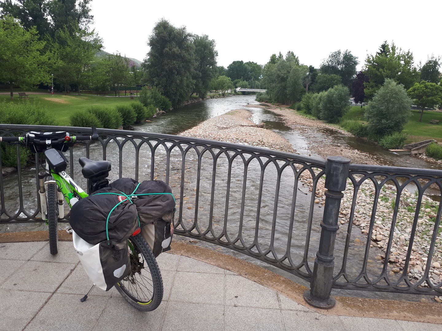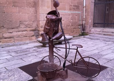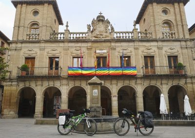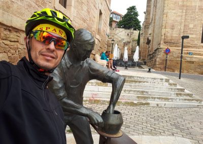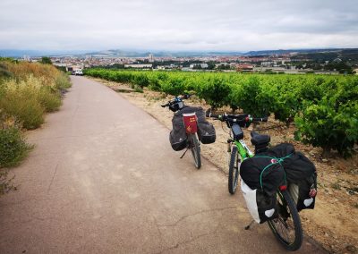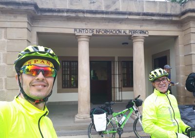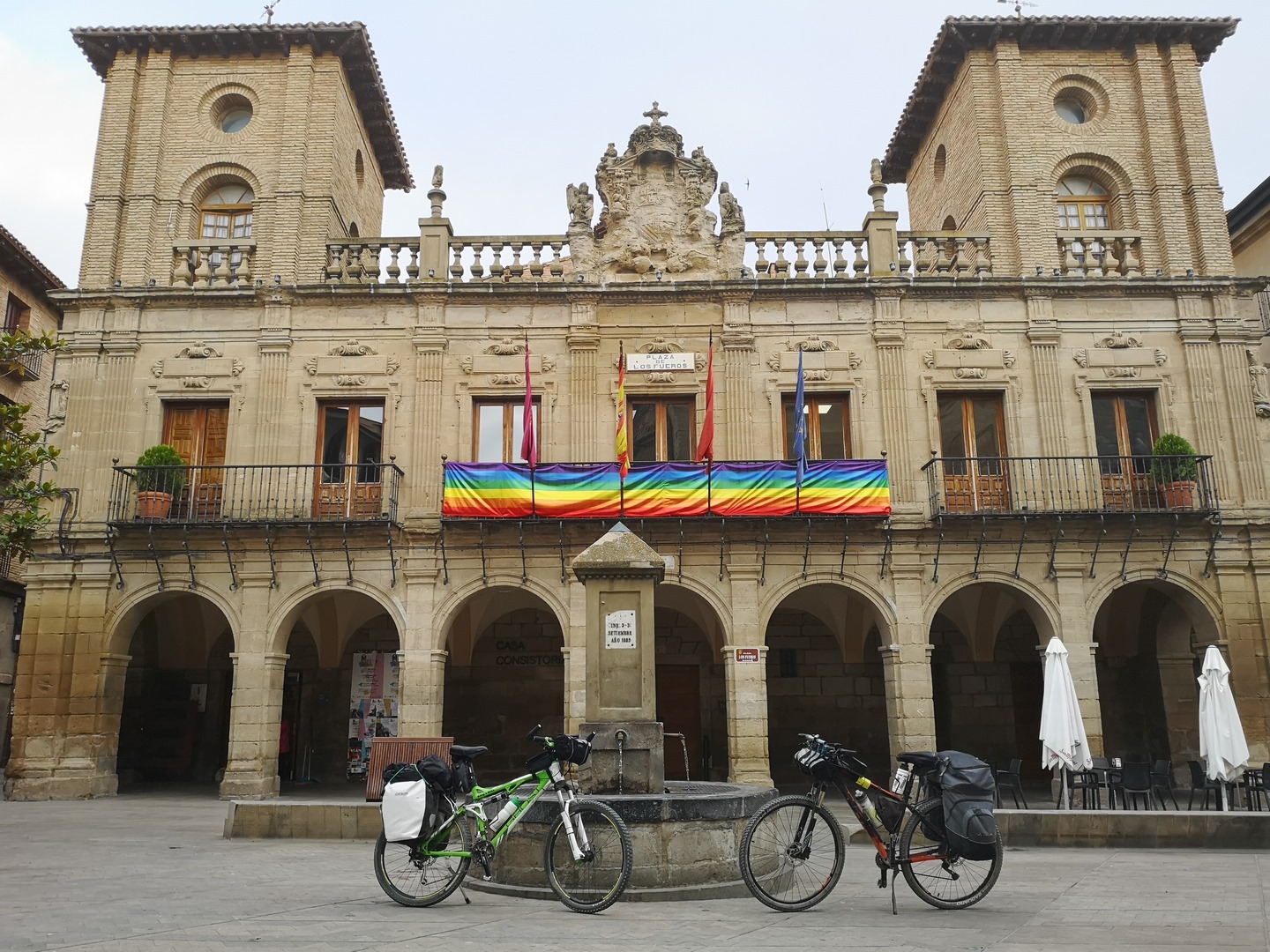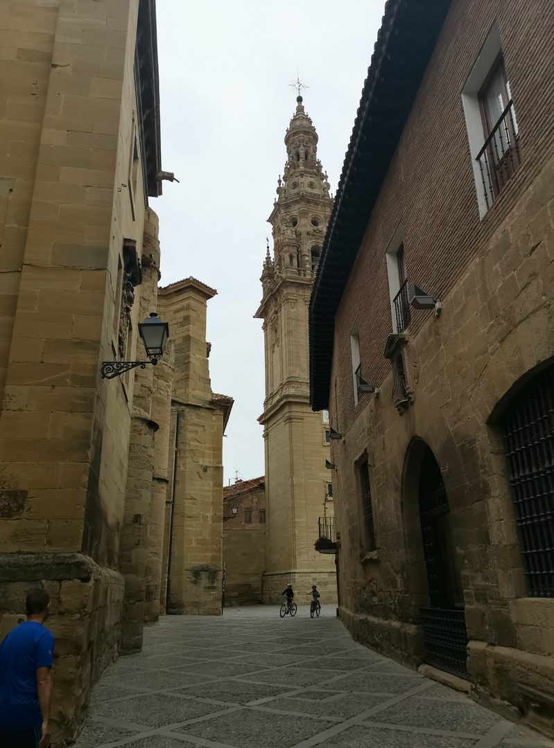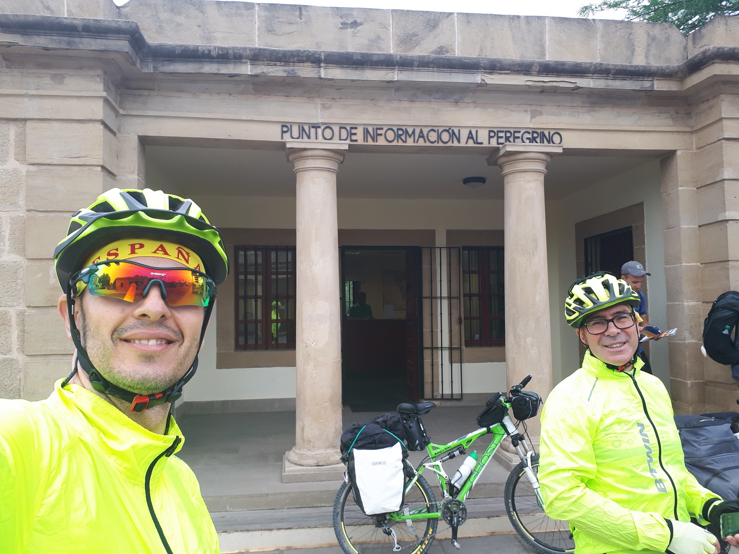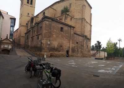 Por fin divisamos abajo, a lo lejos, Logroño, pedaleamos entre viñedos y nos hemos puesto ya el cortavientos porque hace fresquito y bajando se hiela el cuerpo. Llegamos al centro de Logroño donde nos sellan la credencial en el Centro de Información al Peregrino, justamente al lado del río Ebro. Seguimos cruzando la ciudad, hacemos fotos en la Plaza del Juego de la Oca, frente a la Parroquia de Santiago el Real. Parada en el bar Vento, napolitana y un zumo de naranja para Manolo, yo almorzaré más adelante, me apetece un buen bocata pero aquí los que tienen son de juguete.