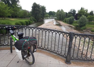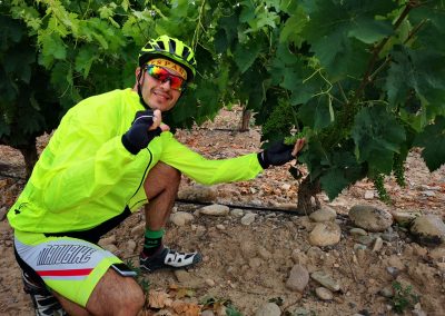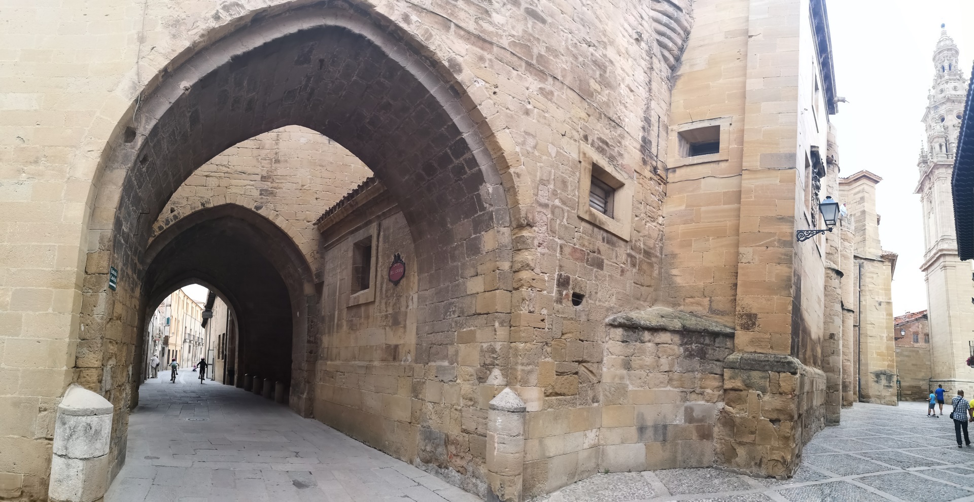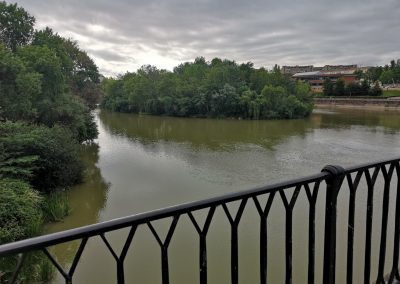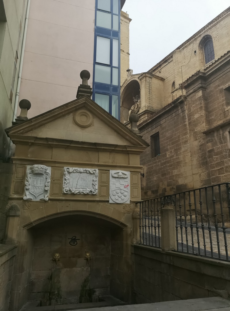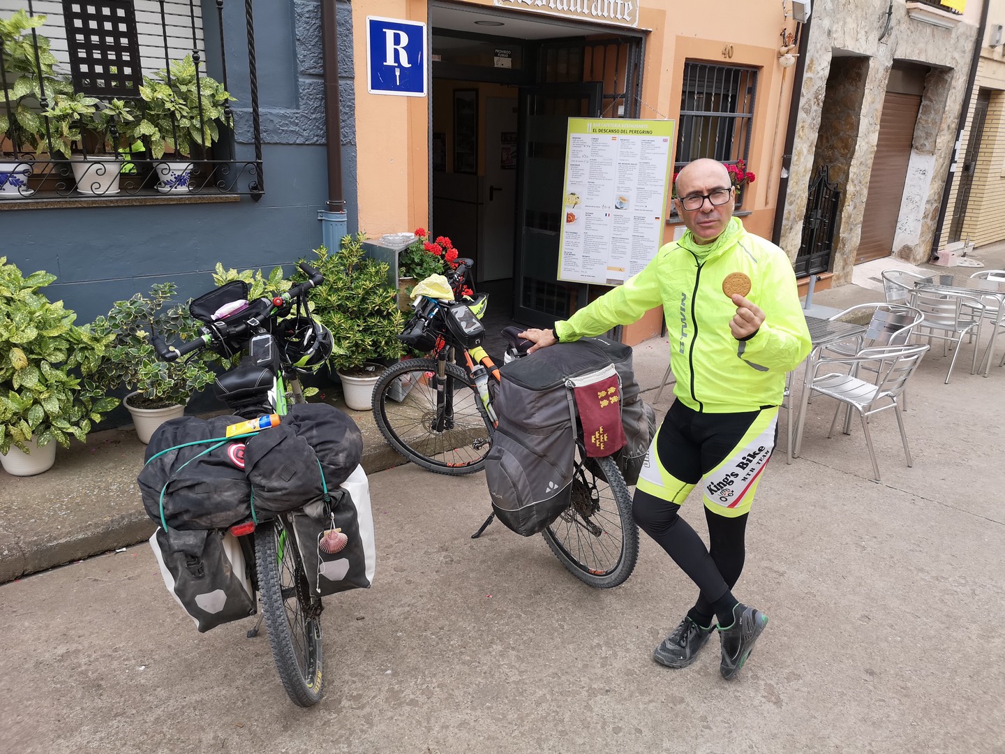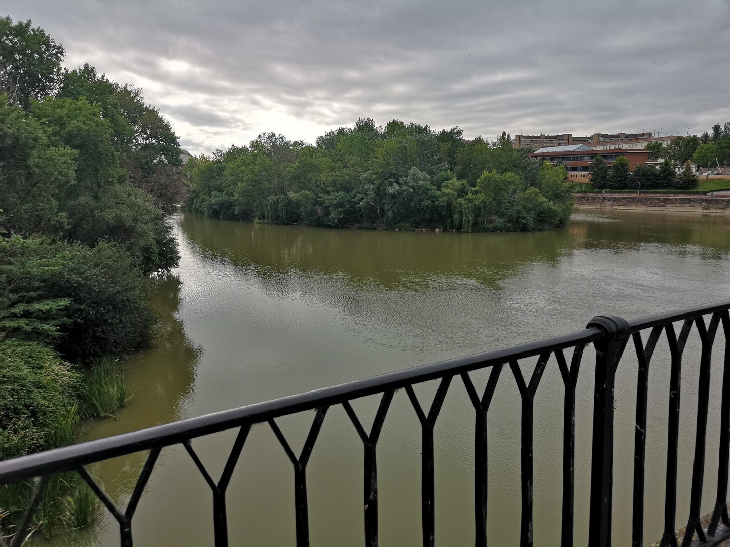 Por fin divisamos abajo, a lo lejos, Logroño, pedaleamos entre viñedos y nos hemos puesto ya el cortavientos porque hace fresquito y bajando se hiela el cuerpo. Llegamos al centro de Logroño donde nos sellan la credencial en el Centro de Información al Peregrino, justamente al lado del río Ebro. Seguimos cruzando la ciudad, hacemos fotos en la Plaza del Juego de la Oca, frente a la Parroquia de Santiago el Real. Parada en el bar Vento, napolitana y un zumo de naranja para Manolo, yo almorzaré más adelante, me apetece un buen bocata pero aquí los que tienen son de juguete.