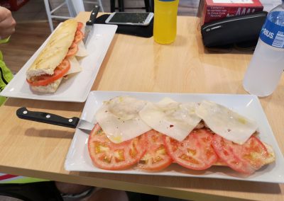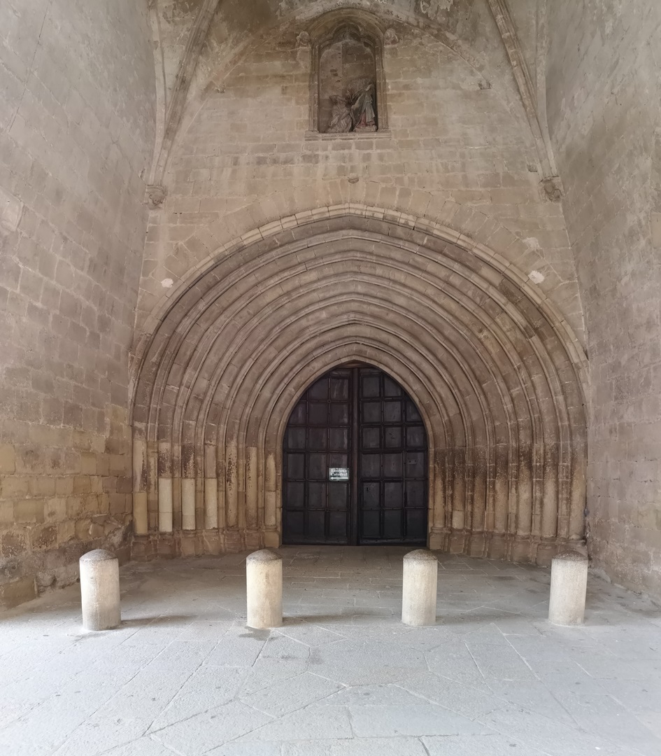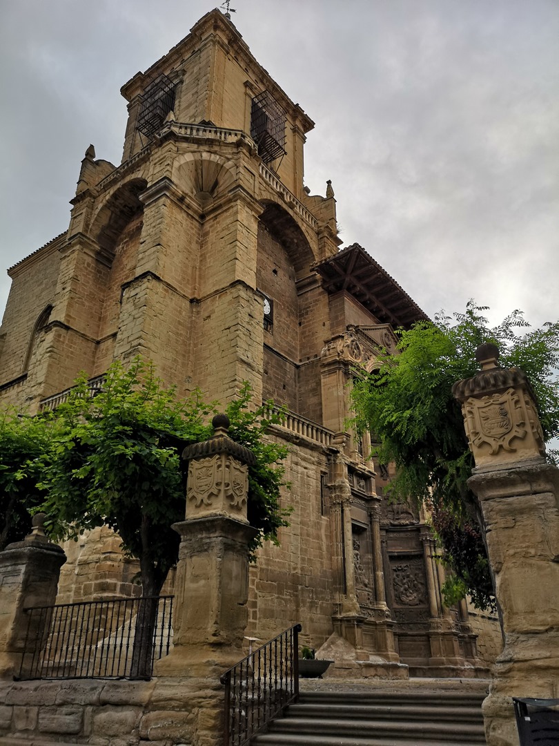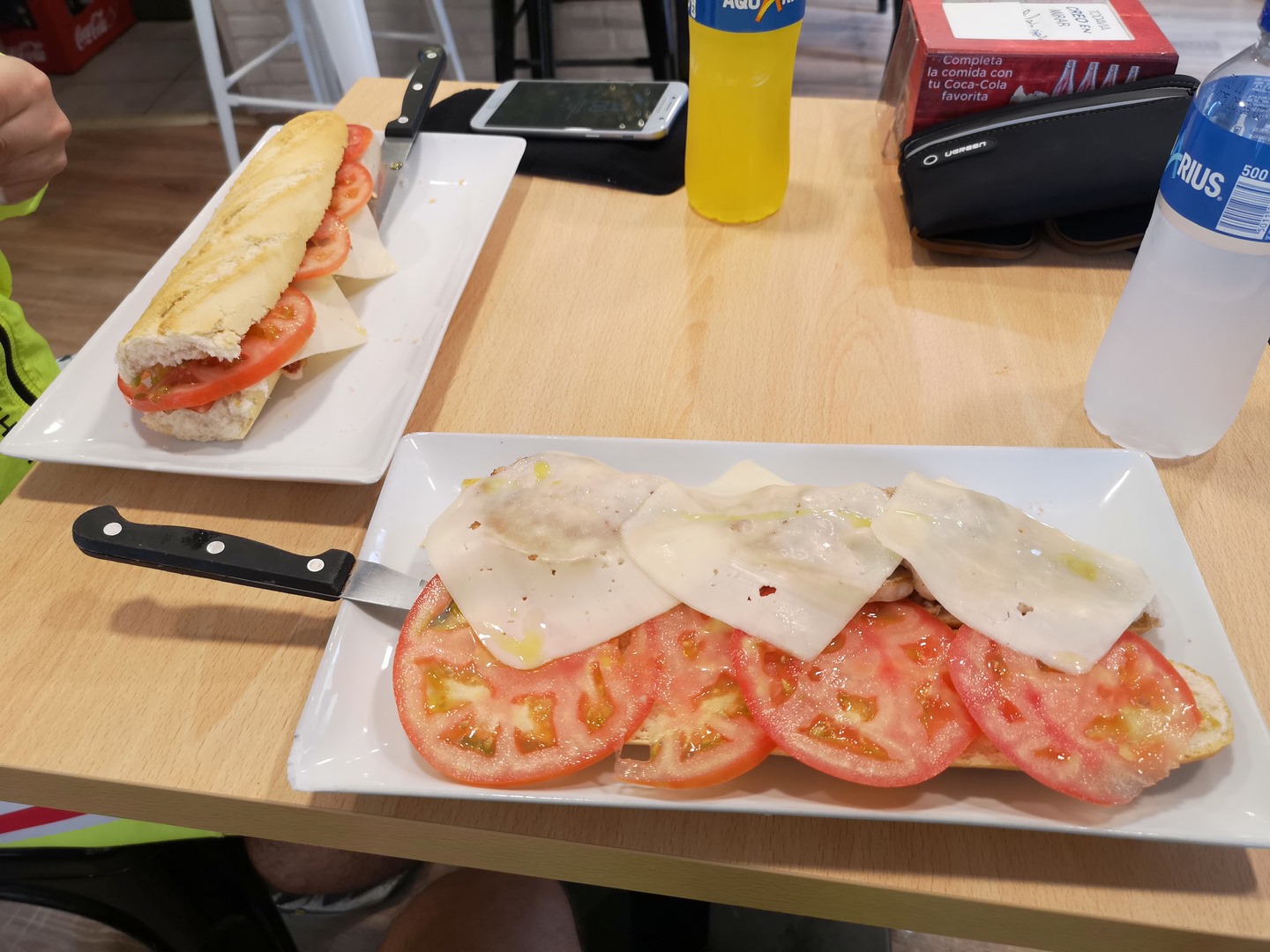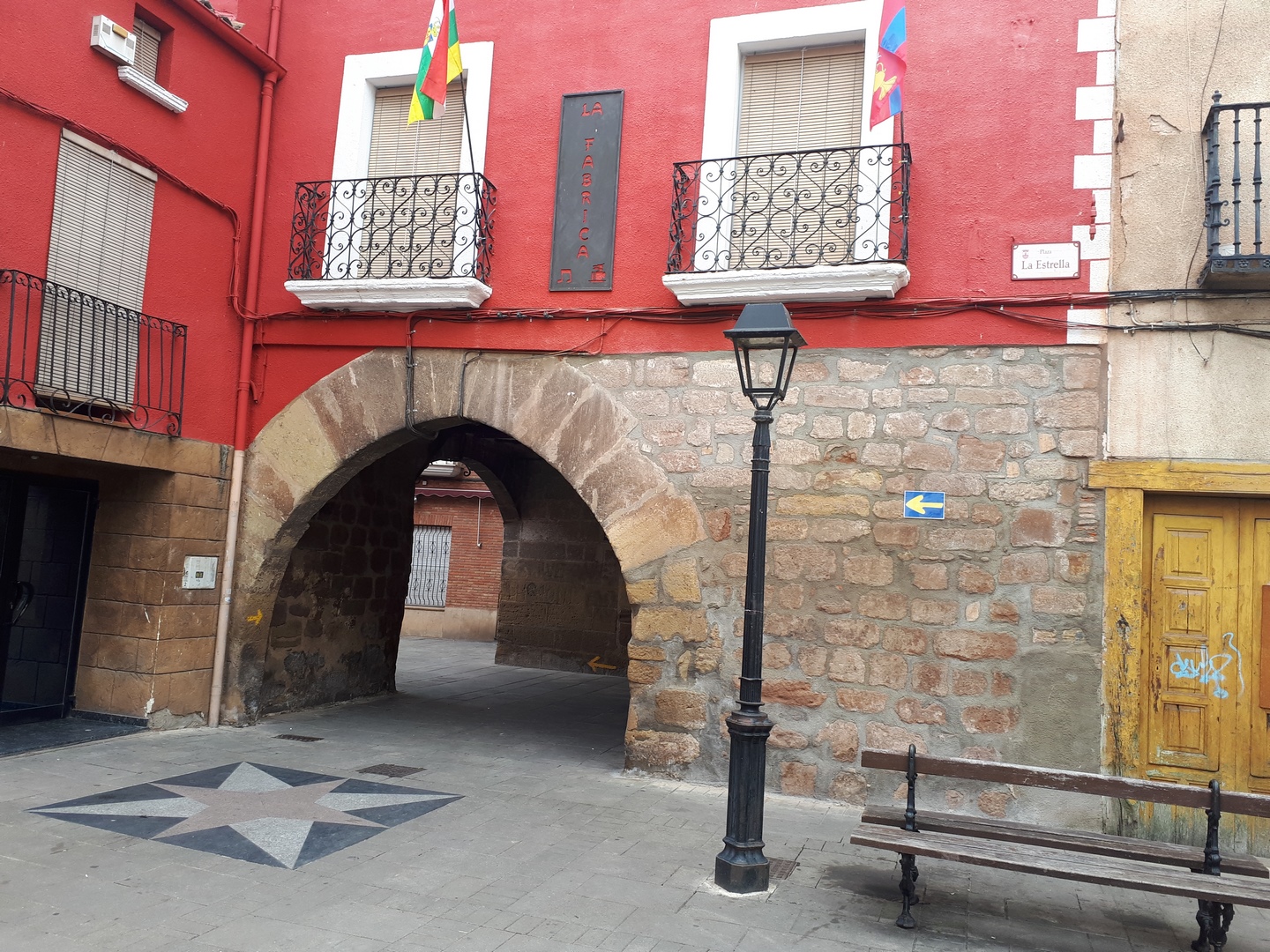Por fin disfrutamos de unos metros de bajada hasta llegar a Navarrete. Naturalmente, Navarrete está en todo lo alto de un peñasco, vuelve a poner molinillo y a subir hasta arriba del todo. Cuando iniciamos la subida del pueblo nos encontramos una escalera, una señora muy amable nos indica el camino para las bicis y nos dice que junto a la iglesia hay una bocatería en la que podemos almorzar como reyes. Llegamos a la iglesia y efectivamente, al lado de la misma nos encontramos la bocatería, nos pedimos sendos bocadillos de lomo, tomate y queso con un Aquarius bien fresquito. Pedazo bocata, resulta que la señora no es otra que la esposa del dueño, un chaval muy amable con el que conversamos durante el almuerzo y nos cuenta algunas anécdotas sobre peregrinos que pasan por su establecimiento.s.