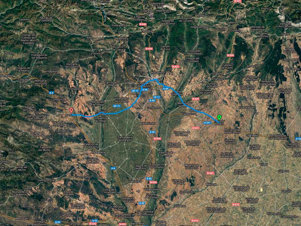 Según la señorita de turismo, nos quedan 46 km para llegar a Astorga. Al salir de León, después de pasar por La Virgen del Camino, nos encontramos con dos opciones, una es seguir bordeando la N-120 y la otra tomar un desvío a la izquierda y abandonar la orilla de la fea y peligrosa carretera. Por unanimidad de dos, decidimos apartarnos de la N-120. Atravesamos la AP-71 por debajo, nos liamos un poco y un pastor nos da indicaciones para las dos variantes. Esperamos que pase el rebaño por el estrecho camino, lo cual tarda unos minutos, cuando por fin pasa la última oveja, al pastor que va detrás del rebaño le preguntamos cuantas cabezas llevan, a lo cual nos contesta que 900, ahí es nada. Siguiendo las indicaciones del pastor y antes de iniciar el camino indicado, se nos tira un mastín de los pirineos corriendo y ladrando como un poseso junto a Manolo que no hace más que pedalear hasta dejarlo atrás…
